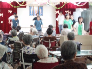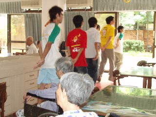 當本家院民做完晚課後,學生們便一一推二、三、四樓的養護院民下來觀賞,老人們被安置好了之後,學生便開始勁歌熱舞賣力的演出。先是學弟妹團體上場表演,配合著輕快的歌聲,院民們也感染了年少活力,場中氣氛十分輕鬆,後來換學長姐登台,氣勢更旺,只見舞台上兩人揮灑著汗水,為本家長者演出及學弟妹作良好的示範。