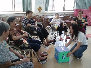 在院民都到達定位之後,大家帶上實習生所做的名牌並圍成一個大圓圈,而主持人開始讓院民們自我介紹,讓彼此都熟悉對方的姓名。而活動一開始是採丟骰子來比大小,每個院民都十分專注,玩的不亦樂乎。後來分為兩組,採小組競賽方式,大家都卯足全力,最後的結果難分軒輊。