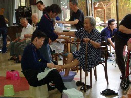 菜香耕的志工們先用酵素搓摩長者的腳,香噴噴的酵素帶走老廢角質也促使長者的血液循環,後來再泡到溫水裡把腳洗乾淨,按摩時志工們都會拿捏手勁讓長者感到舒適,被按摩過的腳紅潤潤的氣血相當暢通,與沒按摩過的大不相同。