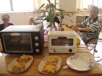香濃披薩烤出來了,院民們滿臉幸福地吃著自已做的披薩,當工作同仁問好不好吃時,案主每個都說讚!而且吃的很開心,這次的做披薩活動是第一次讓院民們嘗試做西式料理,得到的回響也很不錯,大家都很期待下次活動的來臨。