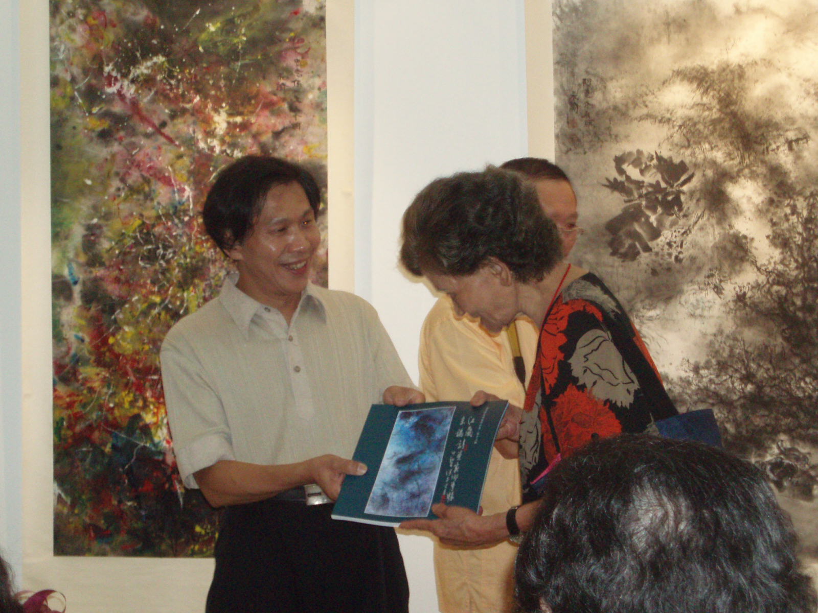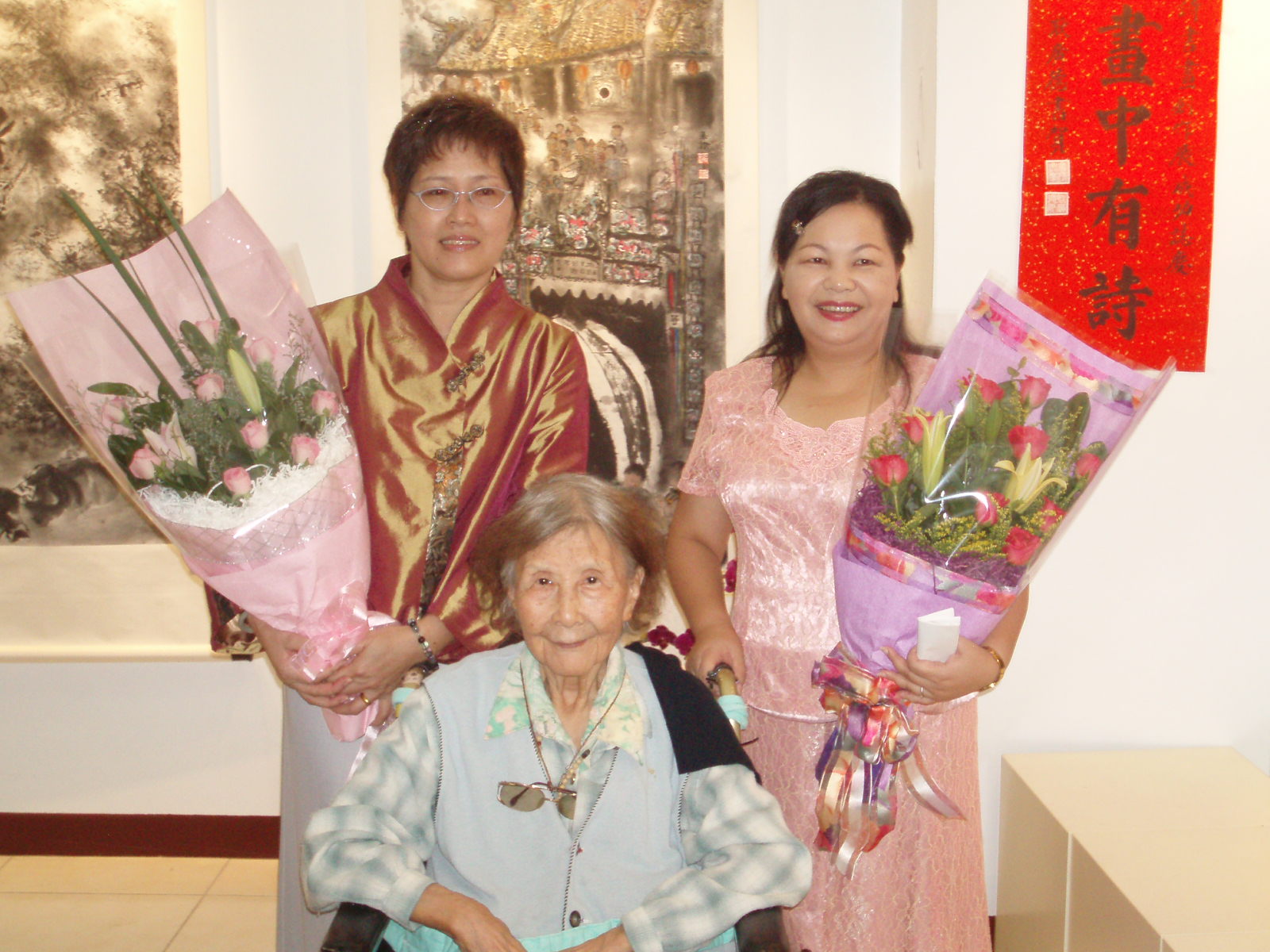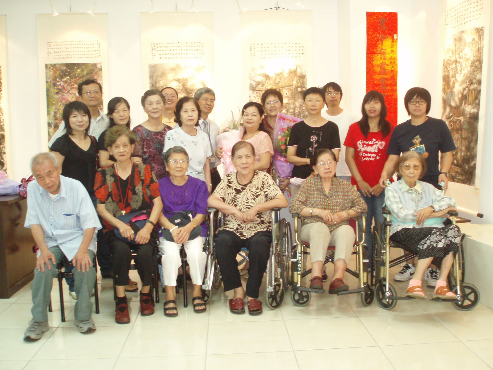 本家長者也受邀參與展覽開幕,長者皆準時下樓並依序坐車前往大里市立圖書館。長者坐在兩排位置上,聽著與客來賓的致詞與兩位老師的作品心得介紹,雖然院民不一定完全了解老師的語意,但也很安靜的聆聽。而本家秘書代表致詞,特別感謝兩位老師對本家長年關懷,所以本院長者知其創作展,便熱切前往參與,之後兩位長者代表獻花予兩位老師,以表心意。