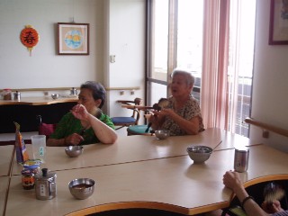 正式活動前,發給每位長輩一根按摩捶棒,搭配著「桃太郎」日本童謠,長輩們一邊唱著兒時最朗朗上口的歌曲,一邊輕敲自己的手、腳、肩、背,抒緩緊繃的肌肉,輕鬆舒適的時刻,讓長輩們對於捶棒愛不釋手。