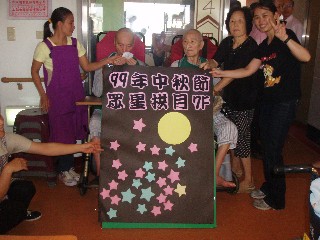 既然是中秋節當然少不了秋風賞月的樂趣啦!因此邀請阿公阿嬤和在場的家屬、同仁一同參與「眾星拱月」的小活動,長輩各個雀躍不已,紛紛將手上的星星掛在月旁並許下心願表祝福,呈現眾星伴月灑清輝的景象。