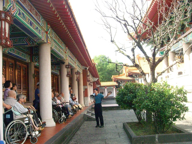 孔廟為許多長輩往日常來的舊遊之地,但也是許多年前的事,透過社工組長與孔廟志工的導覽,才對孔廟的建築及四大特色-孔子樹、燎亭、瘞所、牌樓有更深一層的認識,緊接著一行人徒步行經雙十路與電台街的人行道,來到具有70多年歷史的聲音博物館-台中市放送局,先行於小徑步道上欣賞特有種植物與日據時代的防空洞,後於芒果樹下小憩用茶點,雖然無法進入館內參觀廣播文物,但能欣賞戶外的綠樹與別具特色的現代主義建築,也好不愜意!