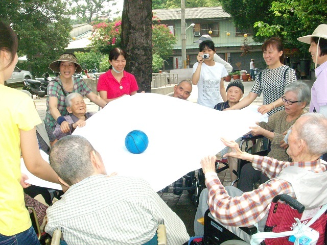 小憩過後是需要動一動的時刻,長輩分兩組拉著布,比賽哪一組的波浪球最穩當,掉球次數最高的組別需表演,球在布浪上滾動,長輩各個都使出力道將球彈到另一方,長輩臉上的表情是既刺激又充滿笑意,黃爺爺還反應迅速的出手將球用力拍出去,引發眾人的讚嘆聲,最後改變遊戲規則為比賽球彈的高度,長輩們更使力的讓布浪抖動的更大。歡樂過後一些長輩玩起相互傳球的遊戲,一旁請陳爺爺在黑板上以螢光筆作畫,生理逐漸退化後的陳爺爺礙於握筆力道較弱而漸捨棄畫筆,在風景優美與歡樂的氣氛下,陳爺爺再拾筆作畫,黑板上的五彩鳥彰顯陳爺爺的心情是彩色的。