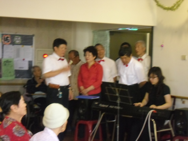 三樓活動一開場主持人邀請三樓長輩來為大家切蛋糕,接著合唱團立即表演五首歌曲獻給長輩及家屬。讓整個會場倍感溫馨。