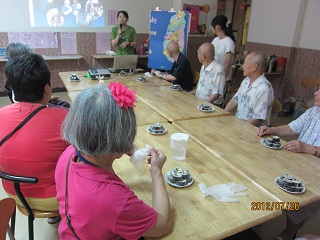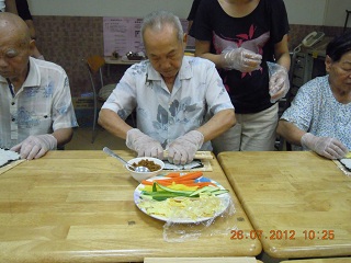 「手作壽司」單元由營養師介紹後,由營養實習生先示範,長輩們認真專注的表情令人動容,後長輩們開始自己動手做壽司,長輩們一一按步驟將各色的材料放於海苔皮上,謹慎的拿捏飯量與配菜,大部分的長輩能自己完成捲壽司的動作,一捲捲可口的壽司切成一盤盤排放整齊的疊壽司令人垂涎三尺,對於這樣的新體驗,長輩們口裏吃著自己手做的點心,踏實感滿溢於心。
