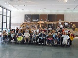 最後來到中庭,雖然因維修而無法靠近巨大的恐龍化石,遠距觀賞也讓長輩們驚奇萬分,後在廊道上休憩、用點心,補充水分與體力,也聊聊所見所聞,長輩們對於貼近生活的茶、農具、草藥、葫蘆等或遠古時代的恐龍化石,勾勒起過往生活經驗也拓展見聞。短短一個上午,穿梭古今,最後在風和日麗的好天氣中帶著滿溢的喜悅圓滿了這場春之旅。