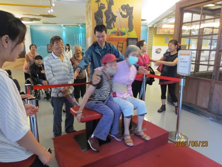 下午我們來到寶島時代村,藉由懷舊的場景呈現長輩年輕時期的文化及社會;讓長輩重溫年輕的回憶。長輩兩兩一組輪流乘坐三輪車體驗,長輩一坐上三輪車嘴角馬上洋溢出笑容,服務人員在前頭賣力地踩著三輪車,長輩坐在車上有的是害羞、有的滿臉的笑靨、有的是樂的開懷大笑;最後本家工作人員都為每位乘坐三輪車的長輩拍照作紀念。