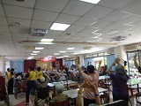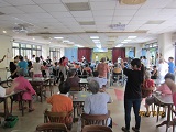 最後一場的重陽活動是由佛光會主辦的重陽關懷活動。由師兄、師姐所引領的健康操,一聲聲充滿元氣的口號,只見長輩享受著活動氛圍,跟隨節奏賣力擺動肢體,展現健康與活力。而延伸至口腔運動時,領導者將ㄚ、一、ㄨ、ㄟ、ㄡ用以誇飾的嘴型,結合肢體動作,讓長輩一面跟隨、一面不禁笑開懷,現場氛圍更顯得熱絡。而為慶祝重陽節,當然少不了應節食品糕點,師兄、師姐為本家每一位長輩準備一份海綿蛋糕及大悲水,因「糕」與「高」諧音,吃重陽糕也象徵「百事俱高」,長輩明瞭其意,更是吃的開心。