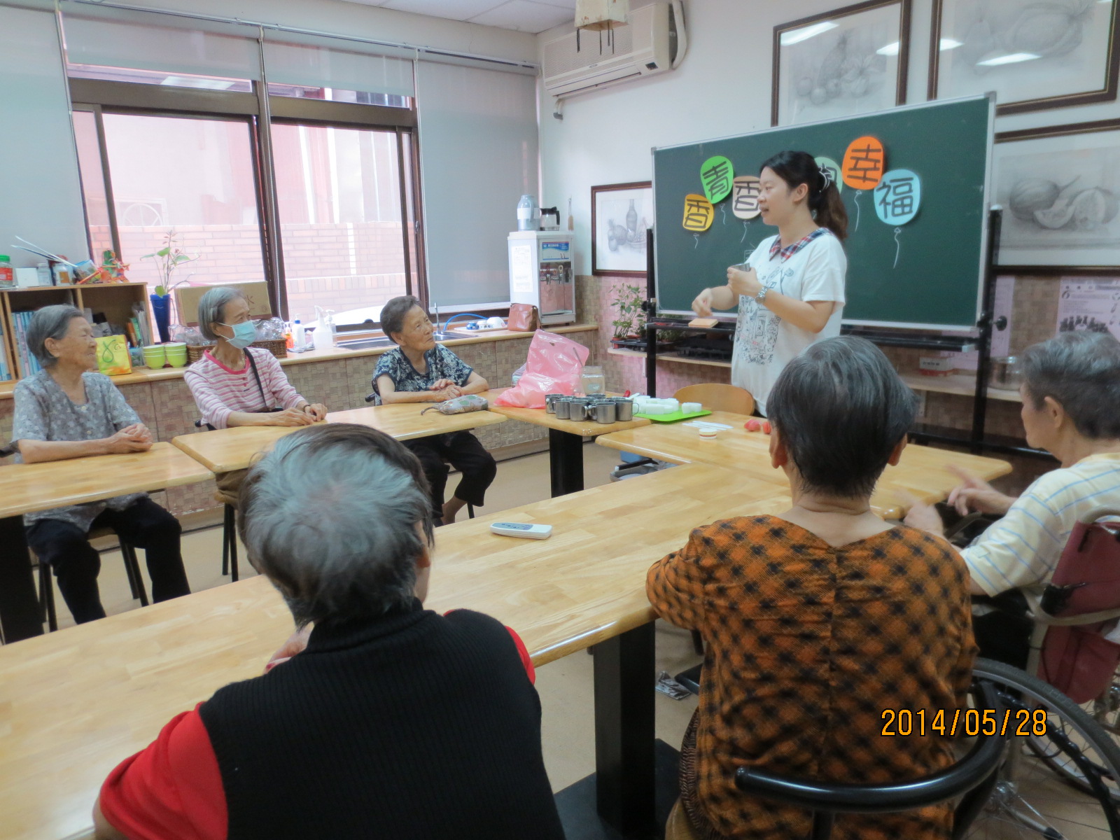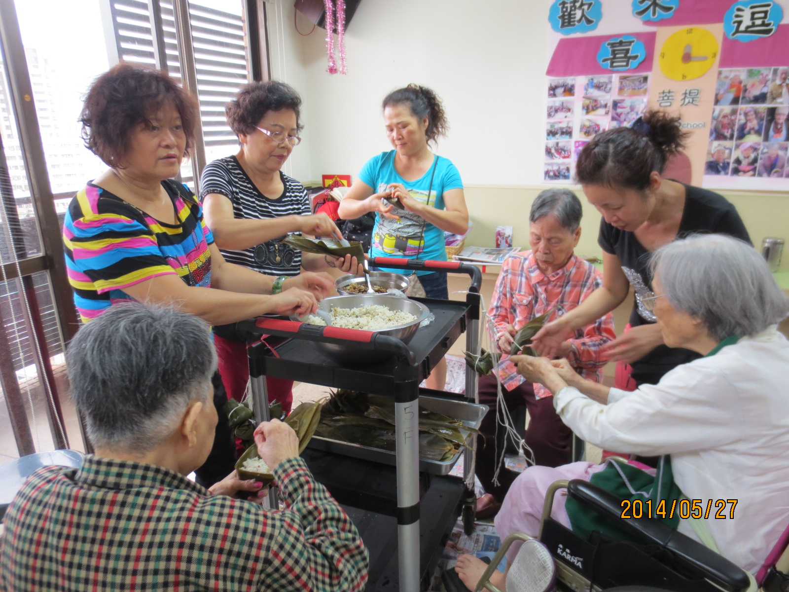 5月27日「粽葉飄香包粽樂」,活動以趣味搶答競賽揭開序幕,主持人先是手舞足蹈道出節慶由來,只見長輩各個聚精會神聽個仔細,於問答考驗卯足全力舉手搶答,而錯失答題機會的長輩也未失落,一面聆聽著其他長輩的分享,一面則與身旁住民分享樂道著,現場氛圍於互動中更顯得熱絡非凡。於傳統的粽子分辨,只見長輩你一言我一語,滔滔不絕的回憶舊經驗後,包粽實作體驗也隨之登場。為了提升長輩皆能參與動手包粽,這次請到「四育國中志工媽媽隊」共襄盛舉,於初次體驗包粽的長輩,在志工的協助下完成了目標,臉上不禁流露出得意滿足的笑容,而有的長輩則是一面道著過往經驗史,一面不慌不忙地完成一顆顆帶有成就喜悅的粽子。中午的用餐時刻,粽葉飄香氣味長輩一同品嚐,也提前共同享受慶端午的過節氛圍。