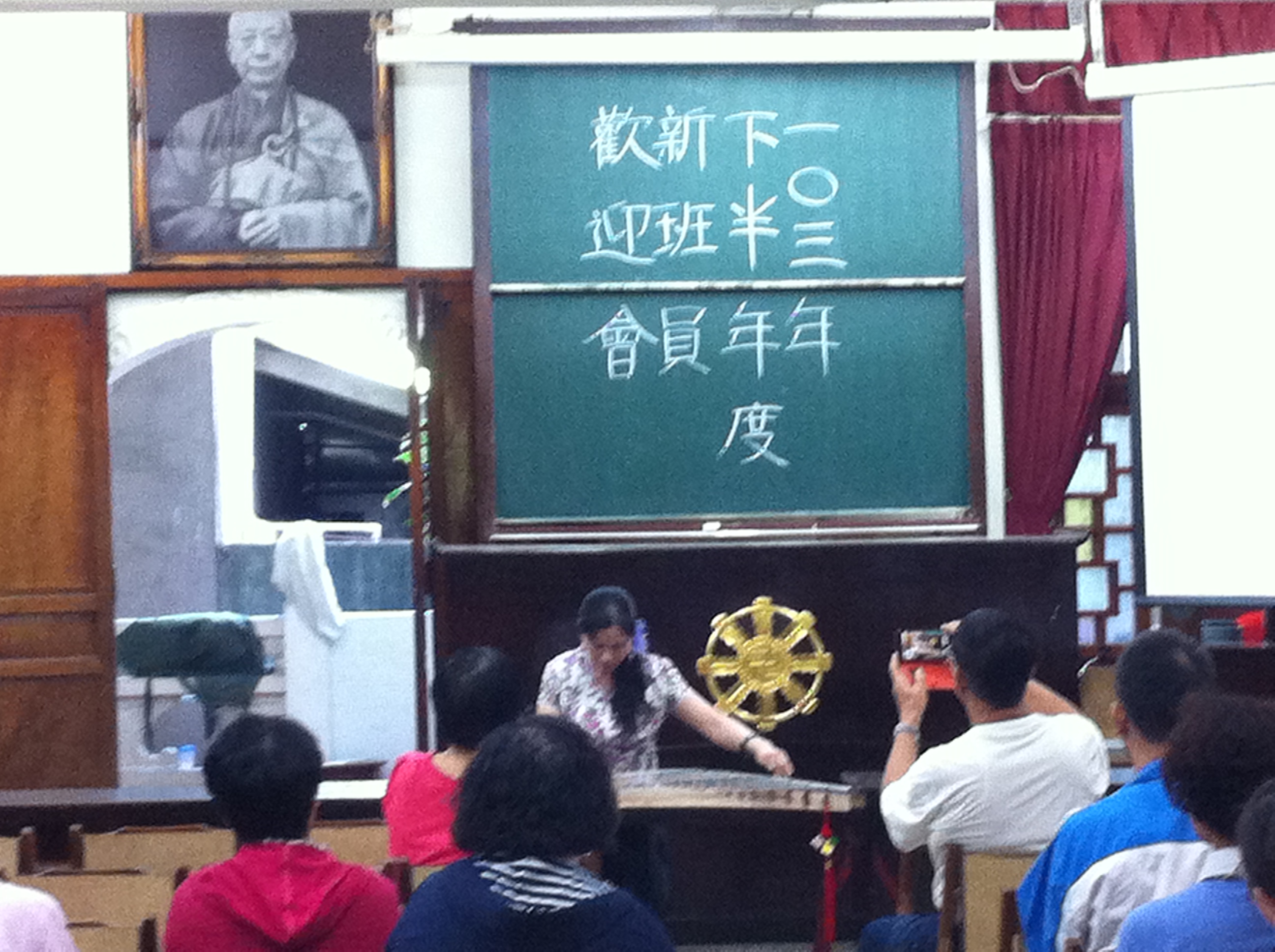 台中市佛教蓮社於103年10月12日上午,在一樓地藏殿舉辦103年下半年度各念佛班新班員歡迎會,本家因張社長囑託,支援歡迎會後段的餘興表演。當天長青學苑古箏班班長池督導帶領班員4人,由彭組長壓陣,專車前往位於民生路23巷14號的蓮社位址。