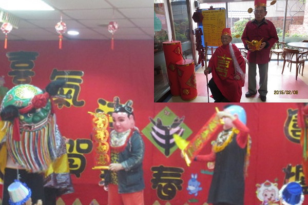 活動以熱鬧的「祥獅獻瑞」開場,由本家工作人員及照服員的子弟擔任獅頭、獅尾、小志工擔任小童子、主任及林長輩擔任大頭娃娃,本家另邀請了三位長輩,由張長輩扮演「福神」、蔡長輩扮演「財神」、李長輩扮演「喜神」,期為本家招來「福、財、喜」氣,盡責的蔡長輩及李長輩換裝後即到大門口迎接入場的貴賓與家屬,而張爺爺雖身體欠佳,但仍用瘦弱的雙手捧好象徵福氣的葫蘆,角色扮演的方式也為長輩帶來正向的鼓勵。