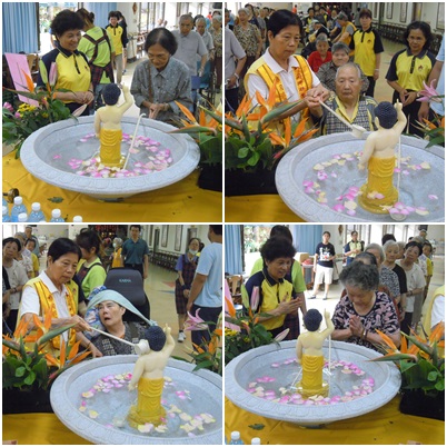 早課後,恭請佛光山法師帶領誦經及開示,不同以往,今年法師與佛光會的志工們還帶來台語歌帶動唱,以農村曲的旋律唱著台語歌-淨土加油站,一邊做著十巧手的動作,活絡了手部功能,以歡喜心開始今日的浴佛活動。在莊嚴的浴佛偈聲,長輩們一一到浴佛檯前虔敬浴佛,一杓淨水,「我願身做好事」,二杓淨水,「我願口說好話」,三杓淨水,「我願心存善心」,在發願的同時淨化個人的身口意。