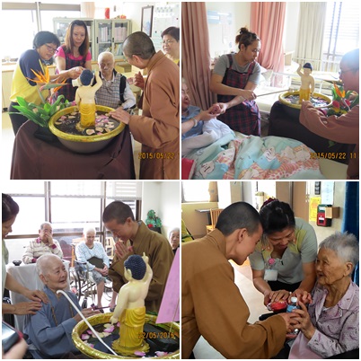 本家有280多位長輩,且4樓有較多的臥床的長輩,下樓浴佛較不便,所以仍邀請法師以行動浴佛車到4、7養護樓層為行動較不便的長輩引領浴佛,法師們先在大廳一一協助長輩浴佛,宋奶奶聽到法師的開示法語,立即眼眶泛紅,留下感動的眼淚。後續法師一一到床邊,照服員協助握著長輩的手拿杓子浴佛發願,讓長輩在這特別的日子亦能同沐佛光,許多長輩已無法用言語表達,原本經常嗜睡的雙眼,因佛像的莊嚴清淨與法師的慈悲言語,紛紛睜亮雙眼。