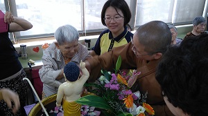 行動浴佛在本家已舉辦第3年,今年也恭請2位法師分別到4、7樓為行動較不便的長輩引領浴佛,法師一一協助長輩們浴佛,張爺爺、呂奶奶因心理挫折、身體不適等因素,雙眼經常緊閉,因佛像的清淨莊嚴與法師的慈悲言語,紛紛睜亮雙眼;陳奶奶平時會有喊叫的習慣,浴佛時和浴佛後,特別的安靜;平時靜靜的林奶奶在浴佛後,笑容特別的燦爛;當行動浴佛車來到劉奶奶床邊,見到莊嚴太子像及法師時,原無特別反應的劉奶奶眼神特別有神、精神也特好。種種法喜顯示法師的攝受力真的不可思議。