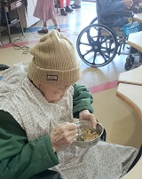 二樓長輩一看到潤餅材料,眼睛開始發亮的說,今天要吃兩個潤餅,一個當下午點心,而有些長輩雖然牙齒有些退化,但是仍看著潤餅點頭說,自己可以吃,最後,在工作人員協助下,將潤餅食材再剪小塊點給長輩食用。三樓的爺爺看到潤餅皮時,一開始謙虛的表示不會包潤餅,後來在工作人員的鼓勵下,爺爺們開始自己動手包潤餅,包完潤餅後,爺爺們開心的說,還是自己包的最好吃,而奶奶也不遑多讓的秀出早期在廚房工作的經驗,將潤餅包的穠纖合度、大小適中,已經可媲美外面賣的潤餅囉!四樓長輩雖然大部分手部功能退化,但是在家屬及工作人員的協助下,長輩們都可以享用到美味的潤餅,平時食慾不佳的爺爺也吃得津津有味,露出滿足的笑容。而七樓長輩,一看到潤餅皮,便開始邀約室友、鄰居一同包潤餅,展現出七樓長輩的團結心,長輩們包潤餅的同時,開心分享著過往經驗,好不熱鬧啊!