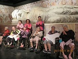 約莫30多分鐘的車程,我們終於來到了敦煌石窟特展的場地,確認每個長輩都有陪同的人員後,大夥兒就進入展間參觀,第一區主要是介紹敦煌的所在位置,藉由文物展示讓後人了解該地區是宗教、文化和知識的交匯處,也記載了逾千年的佛教演變過程。接著陳展了好幾幅的壁畫,每幅壁畫都有其故事,需要透過文字介紹後再細細地觀看畫才能發掘其所呈現的意境,因為壁畫的搬動挑戰度過高,此區多是由畫師至現地臨摹仿畫所得的陳展,據現場導覽員所說逼真度近乎百分百。