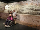該展間最具代表的應該就是一尊長達近13公尺的莫高窟第158窟涅槃臥佛,也是莫高窟最大的一尊涅槃相,莊嚴慈悲的神像讓人在心靈上彷彿得到寧靜安詳,這臥佛前也是這次特展的指定拍照區,志工協助長輩及家屬們在此處拍照,在鏡頭前不論長輩們是否有信奉佛教都很自然地將雙手合十。另一區是需要拿手電筒進入欣賞的洞窟藝術,不論是洞內的上方藻井、花磚或是牆面上的壁畫、塑像都是按照原比例複製,讓我們有如身處敦煌洞窟般真實的感受,法師長輩告知念佛多年,第一次看到這些特展除了驚訝外也對佛教有許多的感動,全程雙手合十,口中不時的誦念佛號。