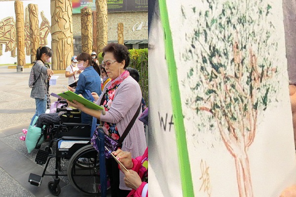 一行人到達國美館先行集合於大廣場,「我是大畫家」讓每位長輩先用蠟筆畫出樹枝,再依個別興趣或能力用「樹葉拓印」或「指印」來完成自己的一棵樹,有些長輩也將眼前的巨型雕塑-圖騰圓柱等畫入自己的作品中,這是到了戶外才能有的環境刺激效益。藍天白雲的晴空下,家屬或工作人員一對一陪同長輩拿起畫筆、樹葉、顏料在紙上創作自己獨一無二的作品,王伯伯因生病因素雖無法用言語表達,陪同的太太協助讓王伯伯單手作畫,完成作品的那一刻,臉上掛著是滿滿的微笑,還豎起大拇指來表述今日快樂的心情;曾是舞蹈家的趙奶奶,97年因車禍骨折入住本家,本家照顧下及自己每天堅持運動,今年已87歲的高齡仍精神活力十足,雖很久沒有嘗試作畫,但藝術的種子仍在,蠟筆畫出枝幹後,再用乾水彩的方式點綴出茂盛的樹葉,趙奶奶看著自己創作的美麗畫作,滿心歡喜地拉著工作人員一起與畫作合影。長輩的生理狀況雖有個別差異,但依不同需求,獨自或共同協助下創作出獨一無二的作品,「創作分享」時主任帶領讓每一位長輩的作品在大眾面前分享和鼓勵,長輩各自展示自己作品時臉上略顯害羞的表情,但眼神中閃爍著的是自信與滿足的光芒,長輩們能完成一件屬於自己作品的這種價值感,與今日的陽光一樣,心理充滿了光亮與溫暖。