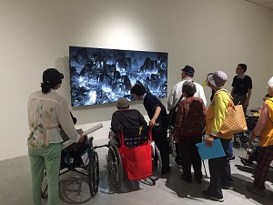 「藝術大觀園」時從戶外轉到館內來參觀台灣當代藝術家「吳炫三的回顧展」,欣賞自然純樸又充滿原始能量的畫作、陶塑、原木巨型雕塑等創作作品;「2050,未來簡史」是國內外多位藝術家,用各種新穎創作呈現出科技發展所改變的未來世界,長輩們站在液晶螢幕前仔細端詳3D動畫科技所呈現的未來想像世界,對於新奇的科技嘖嘖稱奇。從自然純樸的原始創作到充滿未來想像的科技藝術,長輩們在短短一小時內,如同乘坐著時光機穿越了古今與未來。