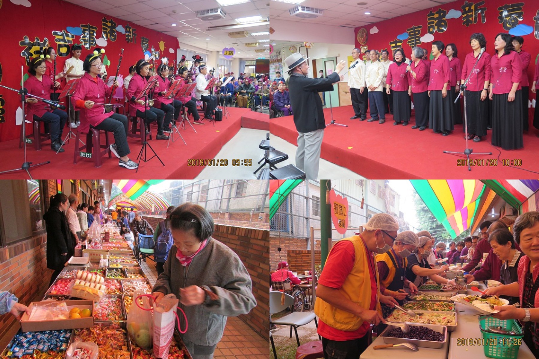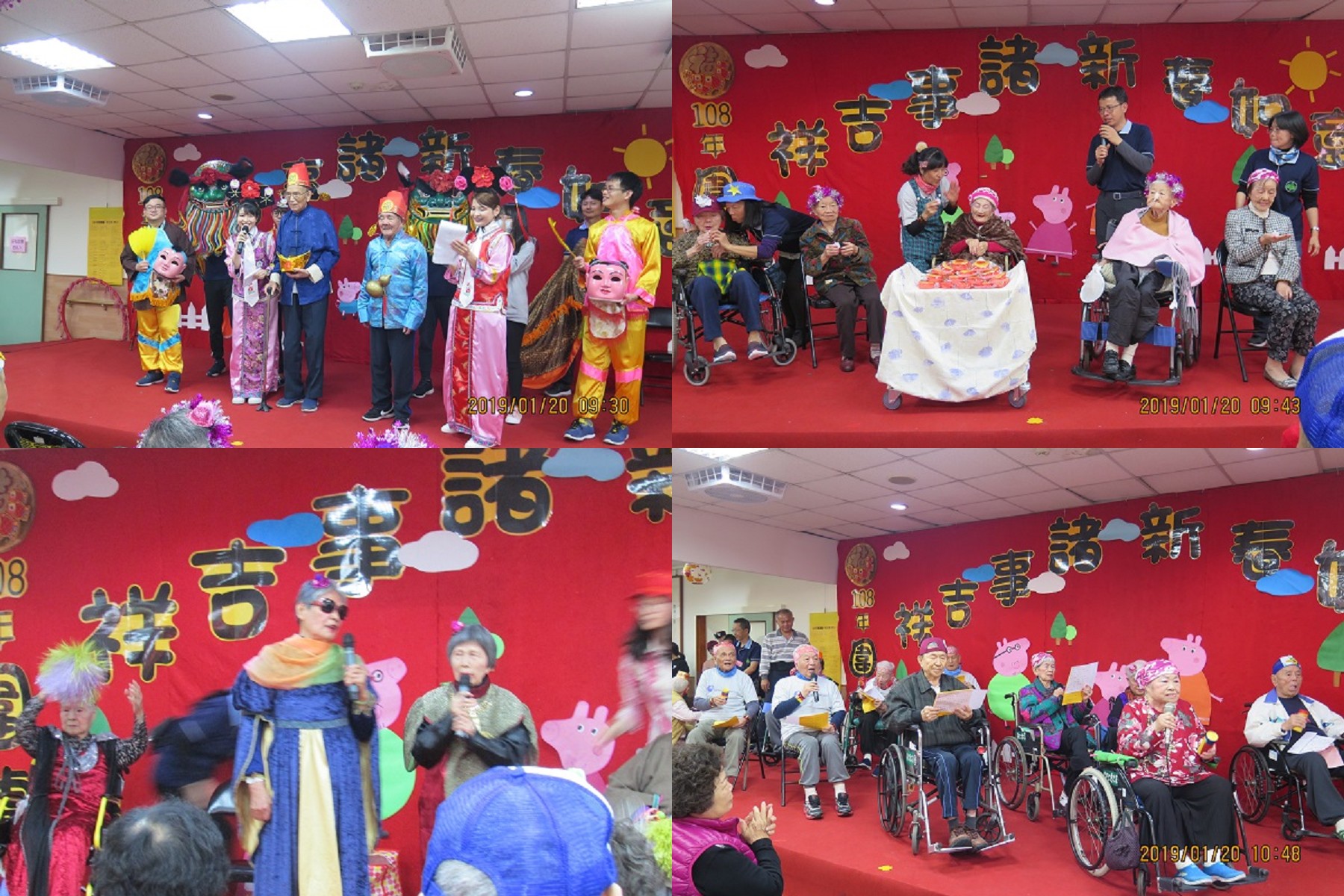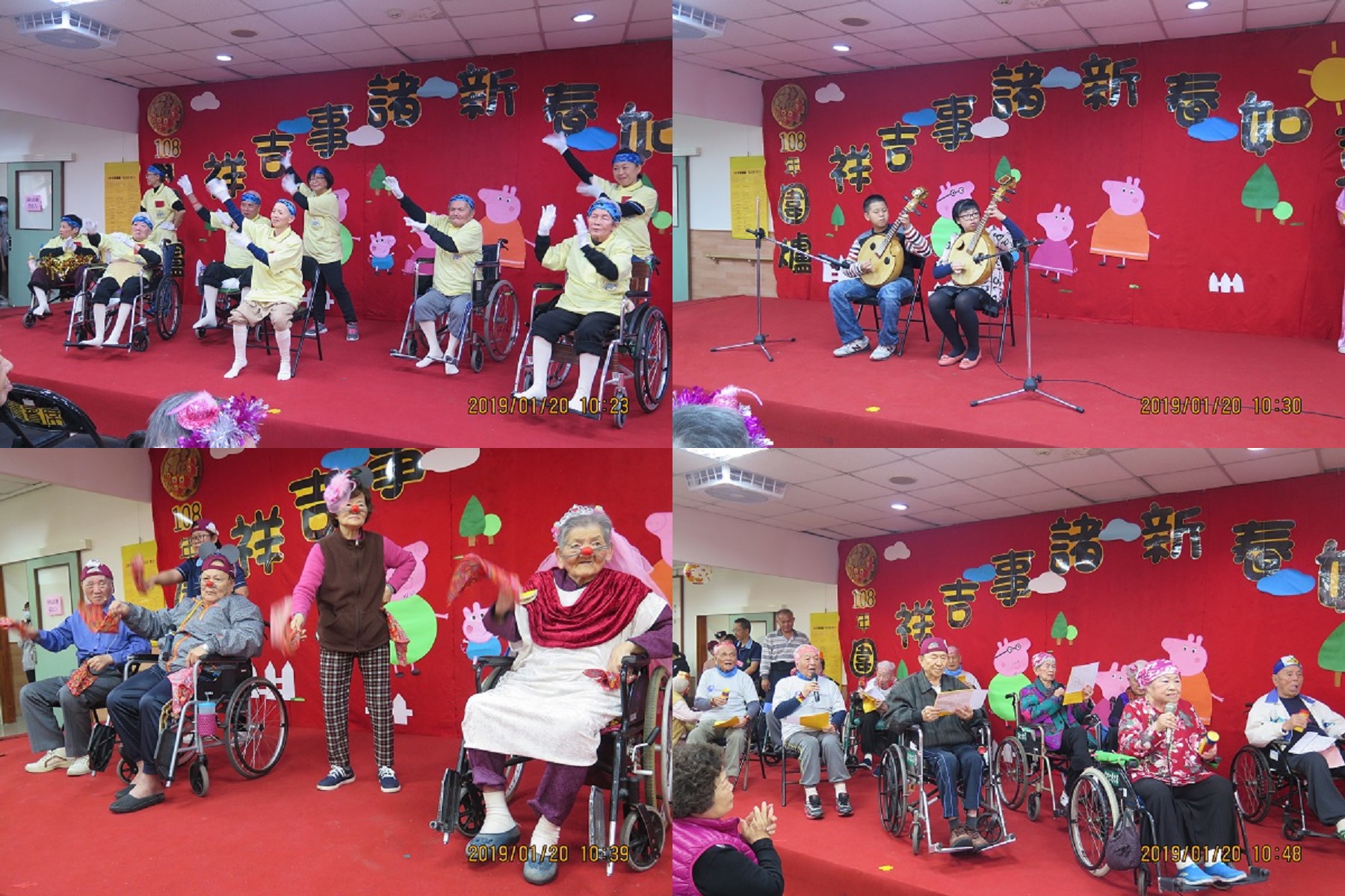 精心籌畫後,活動當天本家一早即熱鬧喧騰,250位長輩陸續到一樓就定位後,先做定下心來做早課,再由舞獅表演與福神踩街熱鬧開場,暖身後先頒發2018年探訪300次以上的孝親頒獎,共有8位家屬獲獎,給予經常來探望長輩的家屬一些獎勵;接著為26位2月份的壽星長輩們慶生祝壽;再由本家長青學苑班的演出拉開表演序幕,二胡班以兩根弦的傳統拉弦樂器演奏出豐富的樂曲、河洛古韻班則以河洛語吟誦詩詞,欣賞傳統聲韻之美。