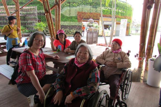 此次出遊梯次輪到五、六樓長輩,也是本家辦花博出遊最後一場,或許是最後一場,此次五六樓長輩報名踴躍,抱著期待又興奮的心情,一早就在門口等待復康巴士,來到外埔花卉博覽會,外埔園區位於麗寶樂園附近,以農業休閒體驗為主,首先走過的就是無患子步道,工作人員排排站,以朝氣有活力的聲音向長輩們道聲早安,為此次的參訪外埔園區拉開序幕。