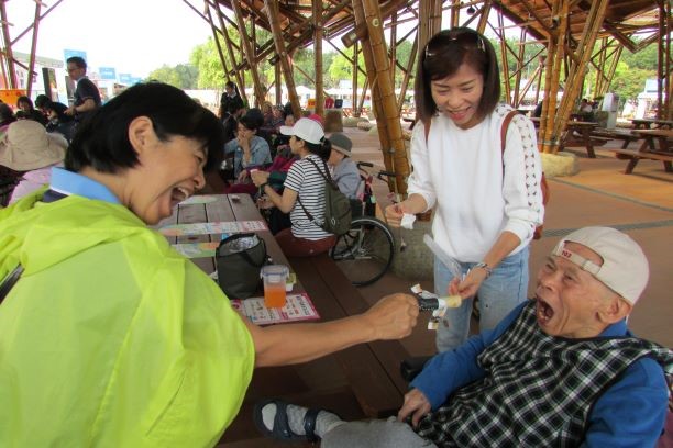 步出步道後,來到了「食在滿竹歇腳亭」休息,今天天氣有些炎熱,工作人員開始拿出點心及茶水,讓長輩補充水份及體力,「食在滿竹歇腳亭」利用古法將竹子、竹材接頭設計所組成的竹構建築物,美麗的建築兼具環保同時也讓大家有遮蔭的地方休憩,詹奶奶看著上面有風扇,更直說天氣涼爽為什麼還要吹風扇,逗得大家呵呵笑,志工阿姨向詹奶奶解釋,那是來自大自然的風,所以才會這麼舒爽!