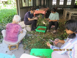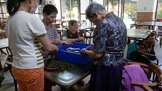 本家每年都會邀請有意願協助的長輩們一同參與處理破布子果實、醃漬等等過程,為住民們的餐點提味,長輩們在親自動手將一顆顆的破布子從蒂頭上剝下時,果皮含有乳白色粘液,黏滑不好抓,手指在拿捏剝除的力道上可說是一點也不簡單!一方面可活動長輩們的上肢手臂肌肉以及手指靈活度;另一方面也換醒了長輩們過去在農村生活時的農忙記憶,一想到這是為了本家所有住民的營養與食療、健康等目的在揮灑著汗水,長輩們各個面帶笑容,專注的看著手中的破布子,運動肌肉的同時又兼具懷舊治療,長輩們在念佛聲中氣氛和樂的合作,一起完成剪、剝、洗、收集種子等步驟,完成工作後的成就感也帶給此次參與活動的長輩們無可取代的喜悅。